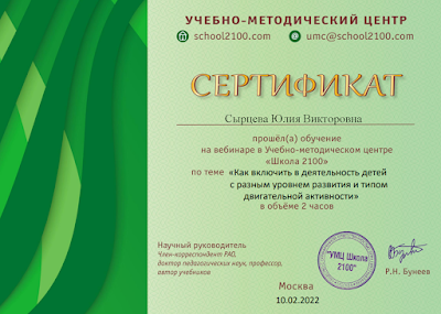 - ГБУ ДПО «Челябинский институт переподготовки и повышения квалификации работников образования». Курсы повышения квалификации по дополнительной профессиональной программе: «Педагогическая деятельность в условиях реализации ФГОС дошкольного образования» с 14.02.2022 - 26.02.2022 (в объеме 72 учебных часов).